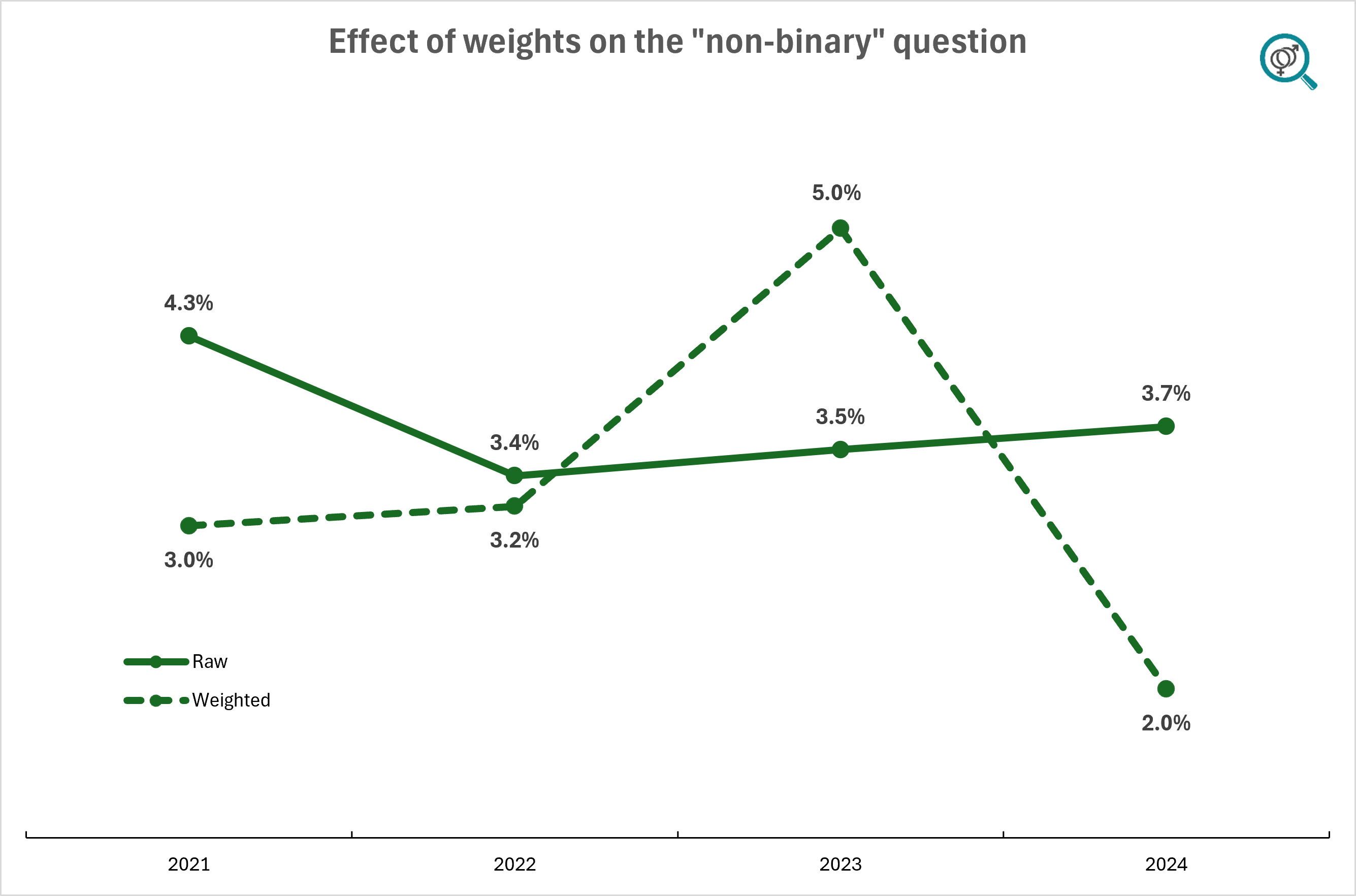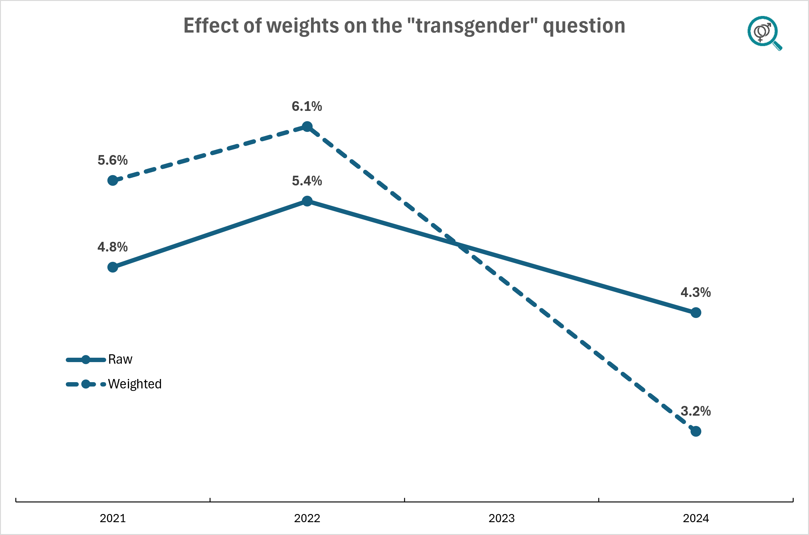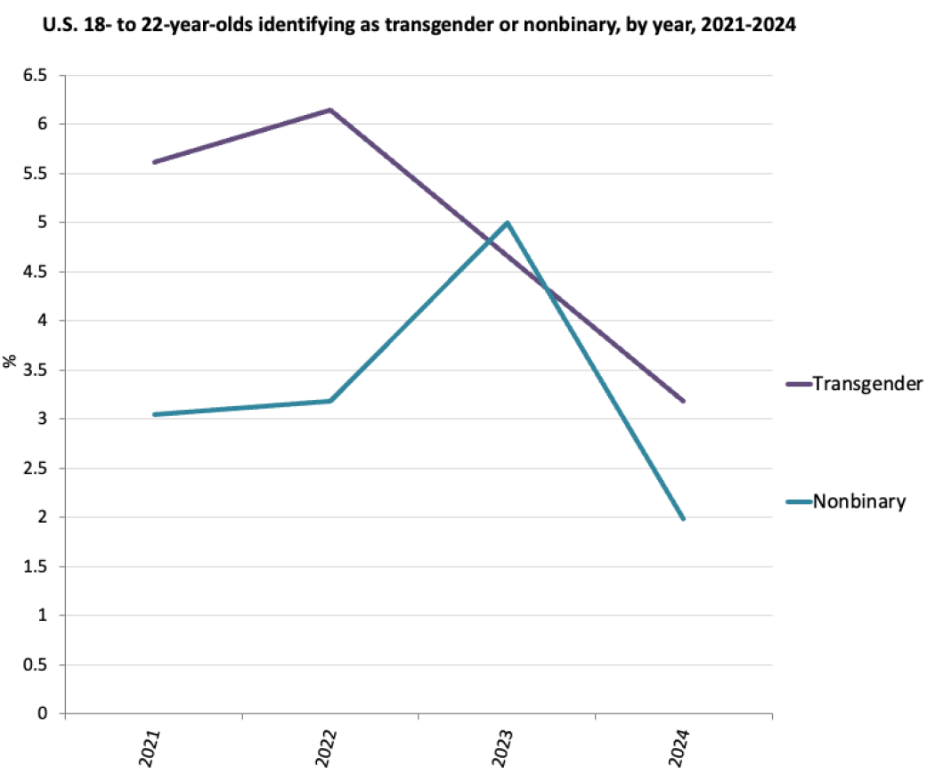 Twenge uses affirmative answers to the question "Do you identify as transgender?" to conclude a marked decline in transgender identification among 18- to 22-year-olds, reporting a drop from 5.9% in 2022 to 3.1% in 2024 using weighted data. While this drop is statistically significant, the finding depends entirely on the use of statistical weights. The unweighted data show a smaller decrease from 5.4% in 2022 to 4.3% in 2024, which is only marginally statistically significant.