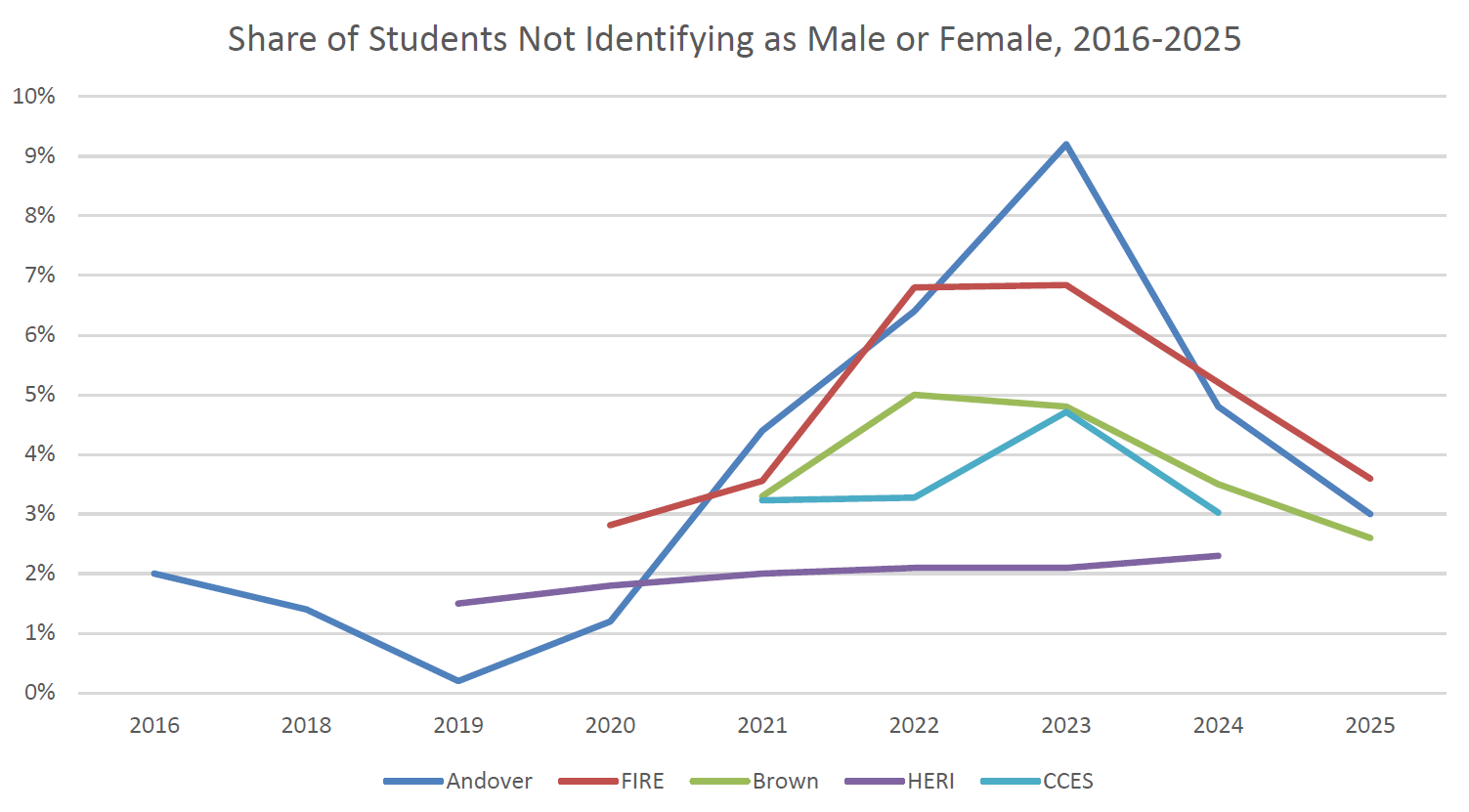 The analysis by Kaufmann used data from a number of surveys, including the Foundation for Individual Rights and Expression (FIRE), the Higher Education Research Institute (HERI) freshman survey, the Andover Phillips Academy annual student survey, the Brown Daily Herald spring and fall polls, and the Cooperative Election Study survey. Kaufmann reported a sharp decline in trans identification, see below: