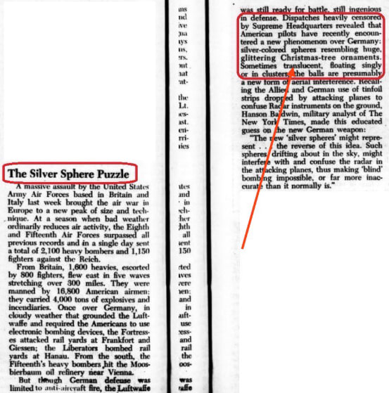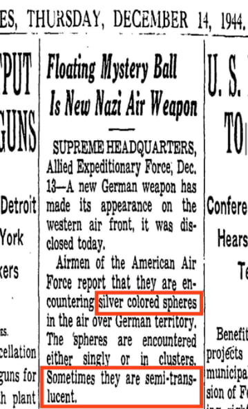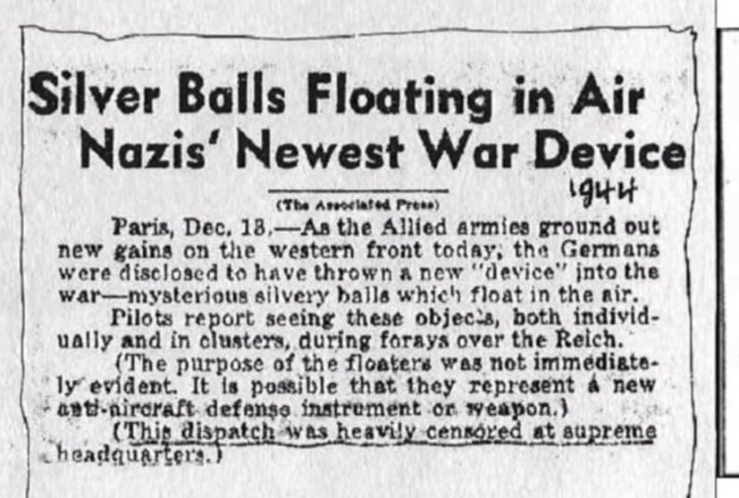Other researchers, including Marik von Rennenkampff, a former State Department official and Department of Defense appointee during the Obama administration, and veteran UAP researcher and author Graeme Rendall, have uncovered news reports from this period that detail numerous military encounters with similar spherical objects. Examples include: