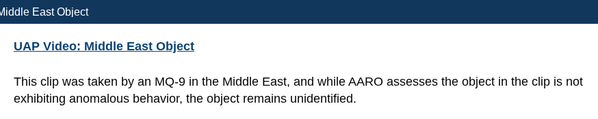 The object above was recorded by an MQ-9 surveillance drone maneuvering somewhere in the Middle East. The incident was highlighted in AARO’s presentation to NASA and remains unidentified, according to the office’s website.