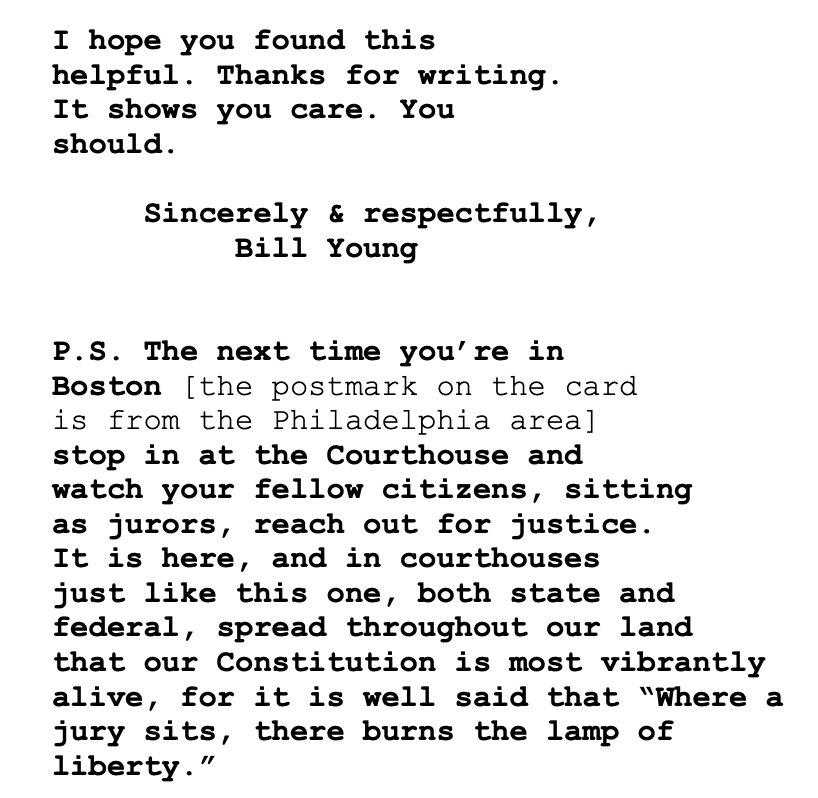 In the midst of his expansive, extensive opinion, Young bookended the ruling by responding to the following post card he noted that he received earlier this year — likely sent in response to a ruling in a pair of cases relating to National Institutes of Health grants.
