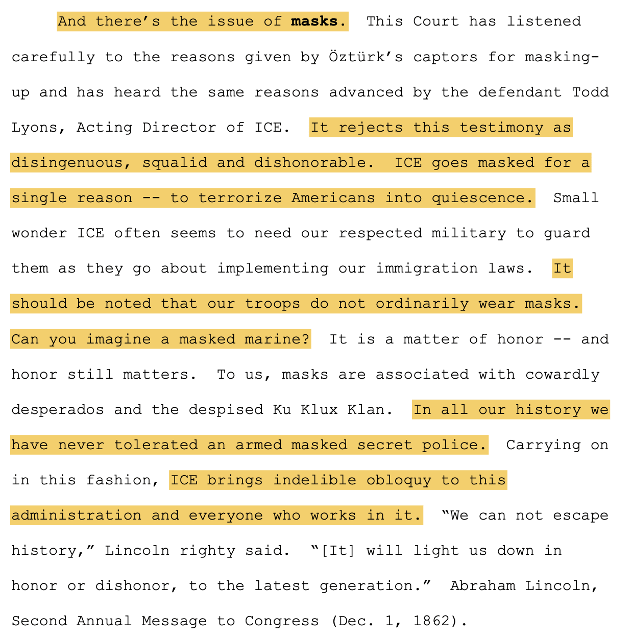 Throughout his opinion, Young focused in on several actions of this administration — allowing Rubio’s horrifying statements to speak for themselves, confronting America with a matter-of-fact description of what ICE is and how America’s immigration system operates, and damning the administration’s use of masks in its immigration enforcement.