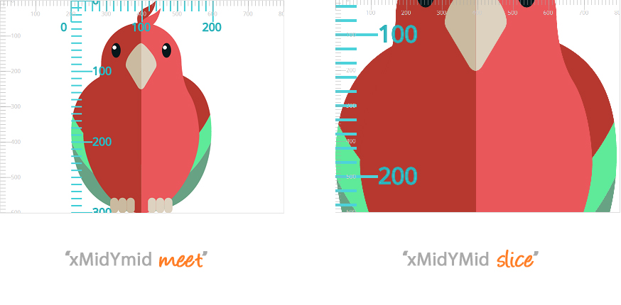 preserveAspectRatio = "xMinYMin slice"These values may seem foreign at first. To make understanding them easier and make them more familiar, you can think of the meetOrSlice value as being similar to the background-size values contain and cover; they work pretty much the same. meet is similar to contain, and slice is similar to cover. Here are the definitions and meaning of each value: