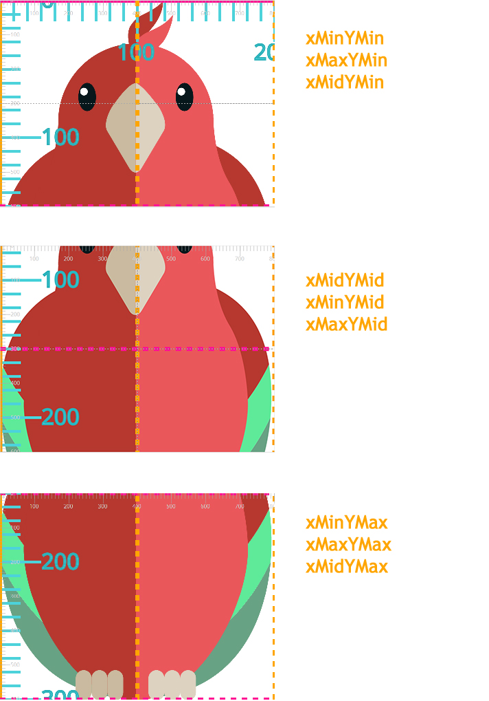 xMinYMin Force uniform scaling.Align the min-x of the element’s viewBox with the smallest X value of the viewport.