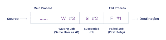 Event #1 has failed and must be retried. Along with the event, we also want to keep track of the number of times it was retried, the failure error code, etc. Event #3 is from the same end-user, so it cannot be sent until Event #1 succeeds or aborts. However, Event #2 is unrelated and should be processed and succeeded.