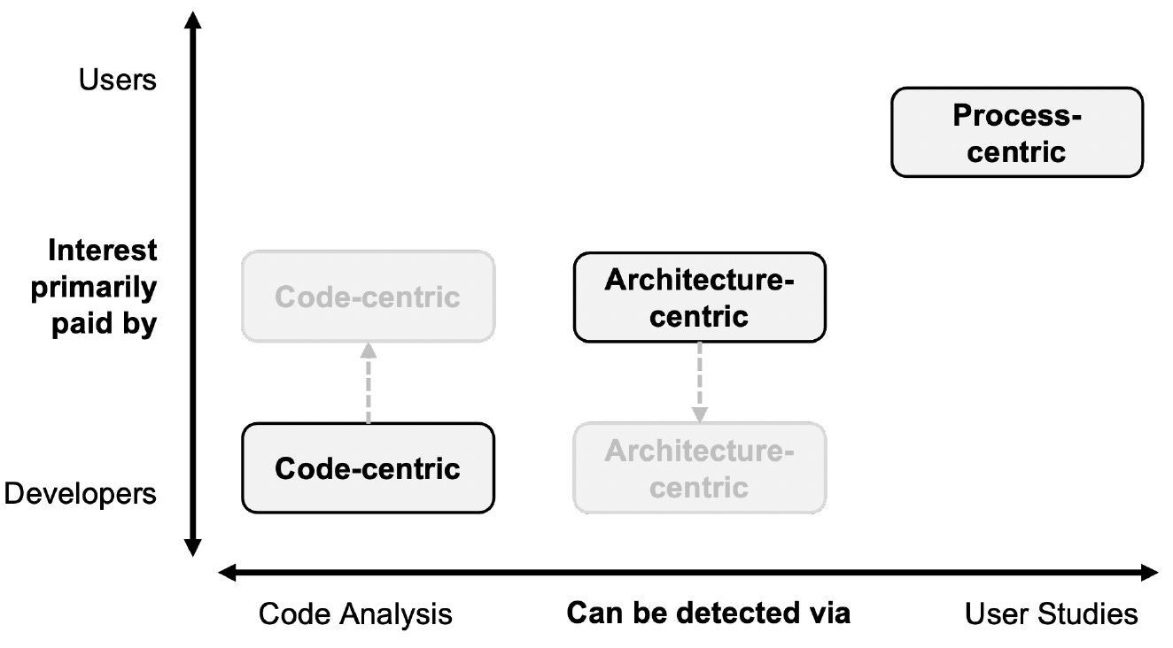 In another example, the authors describe how reusable UI container components were architected for clean separation of concerns and encapsulation. While this approach improved code maintainability, it restricted the team’s ability to reposition UI elements to better align with user workflows. The architecture might be technically sound, but it doesn't facilitate an optimal user flow or intuitive arrangement of UI elements. This type of debt is not easily detectable with code analysis tools alone and often requires user research to identify