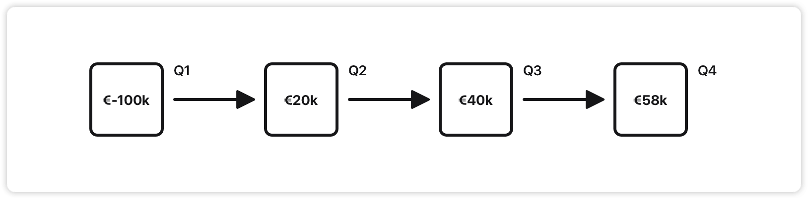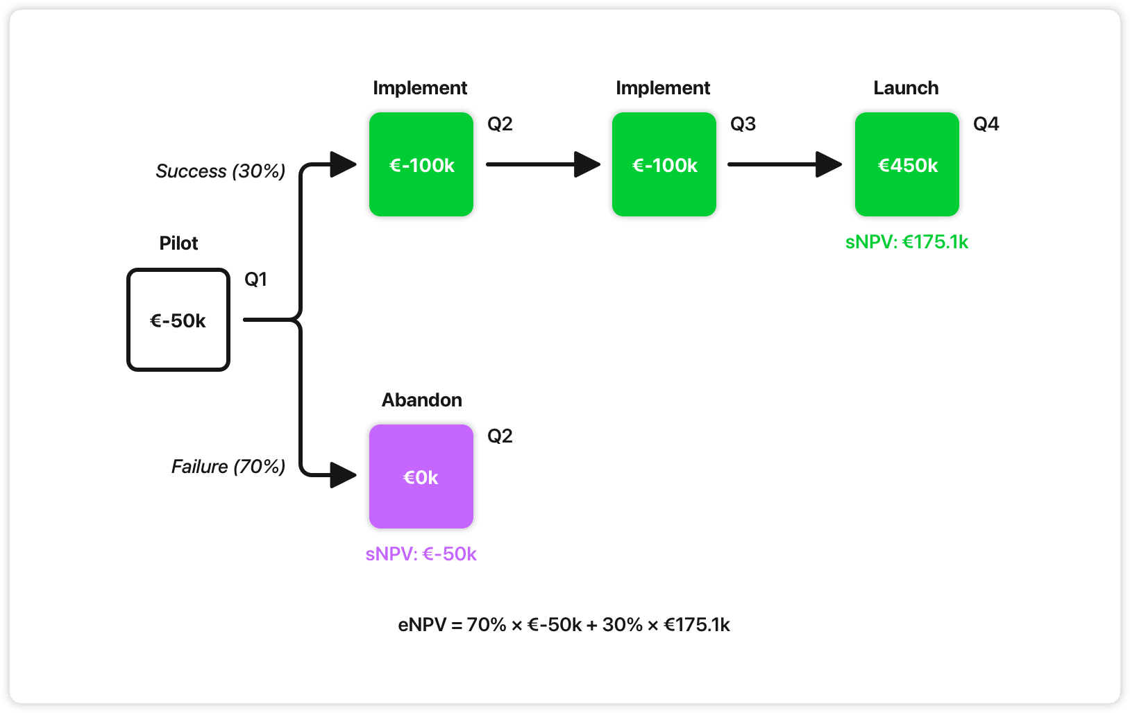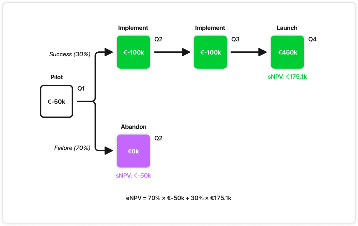 We spend €50k in Q1 to see if it works. If the pilot fails (70% risk), we abandon and lose only €50k. If it succeeds (30% chance), we invest €200k in Q2-Q3 to build the full thing, expecting to generate €450k in Q4 from dynamic pricing benefits.