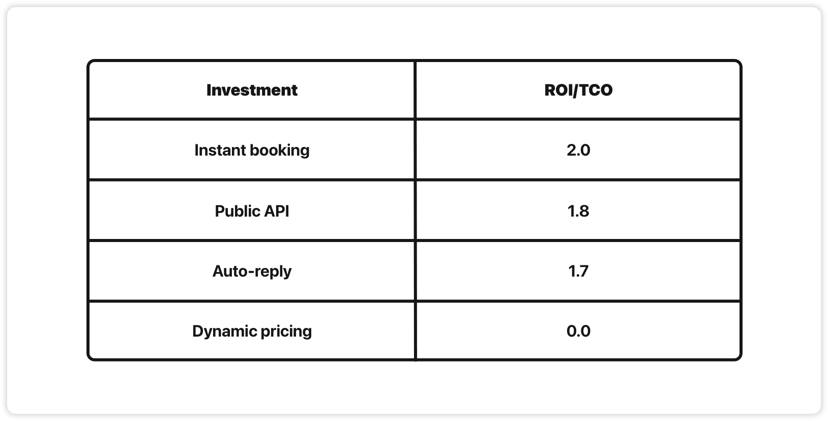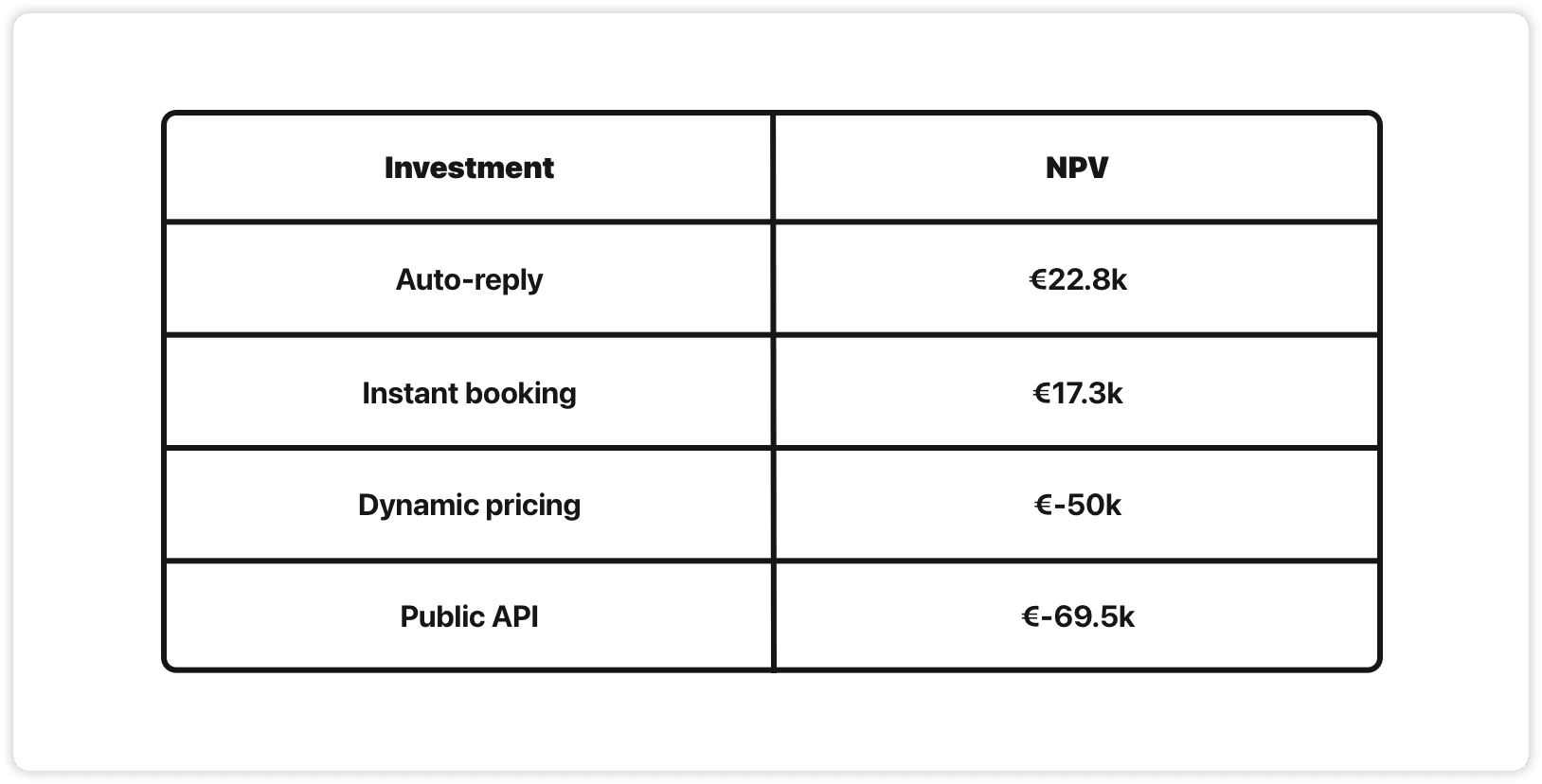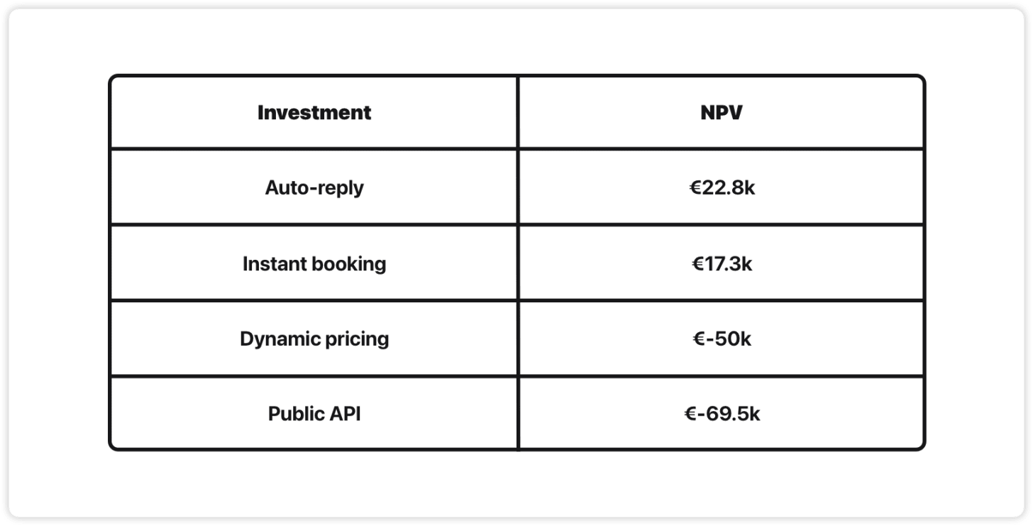 If we rank the projects by ROI goodness, instant booking comes out as a clear winner, public API coming in 2nd. Dynamic pricing isn’t even worth talking about.