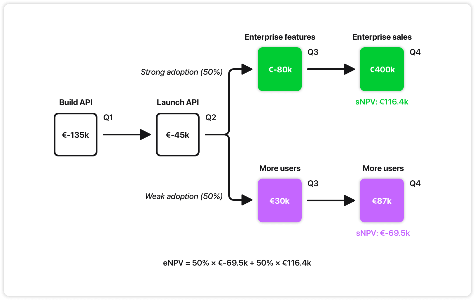 In the diagram below, we’re looking at two possible futures. In the first, we build the API and see weak adoption: this gives us the original NPV of €-69.5k. In the second, we see strong adoption and capitalize on that by expanding with premium features, reaping a new NPV of €116.4k driven by enterprise license sales.