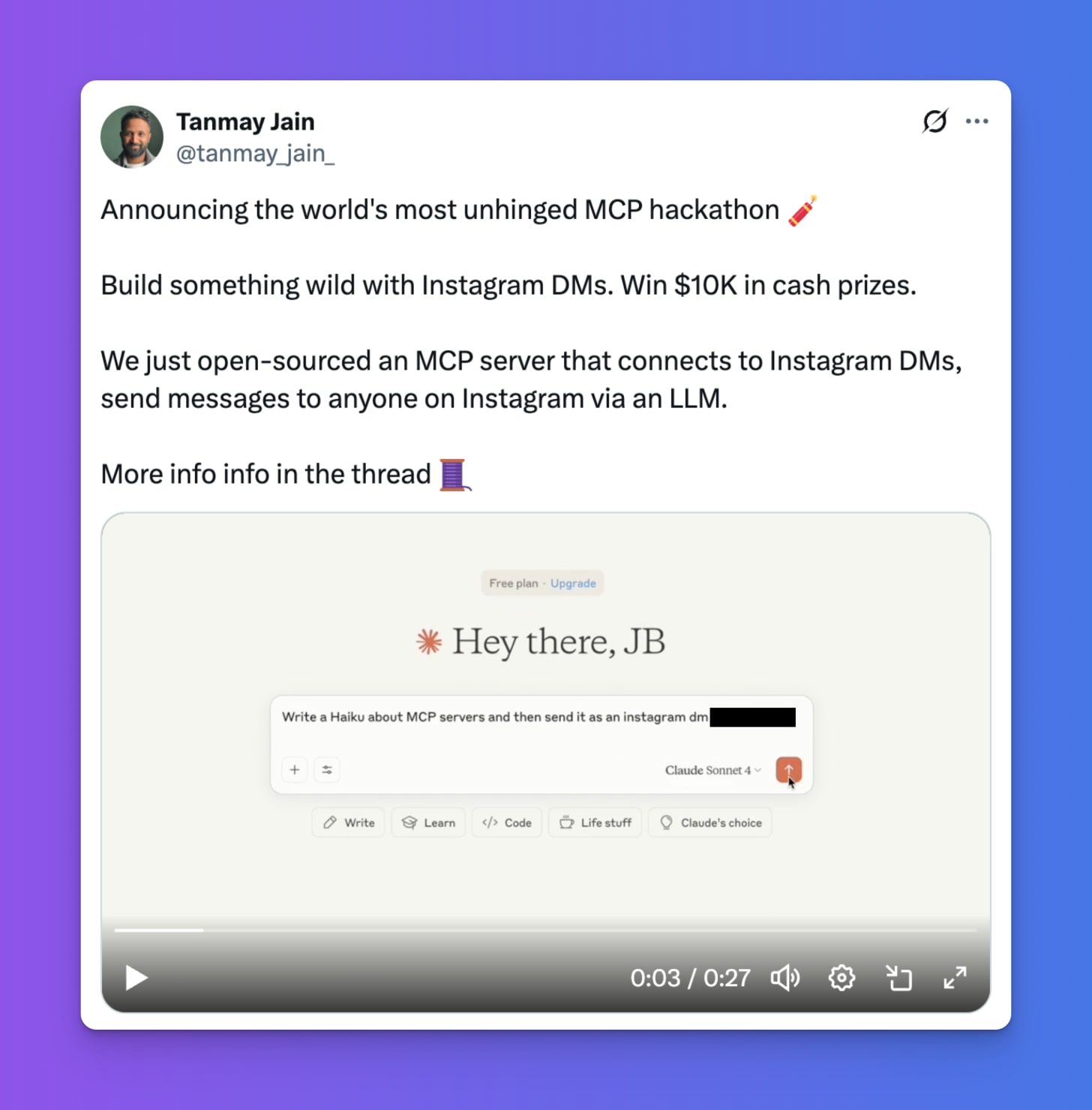 Background: Tanmay is a Product Manager who describes himself as "not super technical." His tool that lets Claude access Instagram DMs directly showcases how product managers can build actual developer tools, demonstrating how AI is democratizing technical implementation.