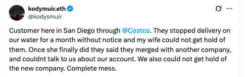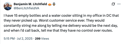 It’s also likely that the quality of the service is declining, as the company is undertaking layoffs of customer support staff. I heard from multiple customers that when they try to switch from Primo Brands because they can’t get anyone on the phone to schedule a refill, there are often no direct alternatives. I spoke with Steve Hunt, who does member support for Costco, and he told me that he recently noticed a “huge influx” of complaints about Primo Brands from Costco customers. Decreased quality is its own form of price hike, because customers are paying the same amount for a worse service.