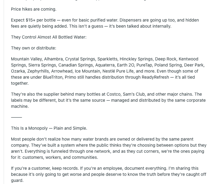 In some ways, the market power of any water delivery service is about switching costs. Customers themselves are locked into the service, similar to a software platform, which allows for the high margins the Wall Street Journal discussed. Today there are a litany of complaints about Primo Brands - the app not working to reschedule deliveries, bad customer service, promises to refill water that are never kept, impossibly long hold times to get on the phone, and deceptive billing. Employees are posting anonymously on Reddit about the firm’s market power, bad service, hidden fees, and coming price hikes, as well as “AI generated scripts” they are supposed to read to angry customers.