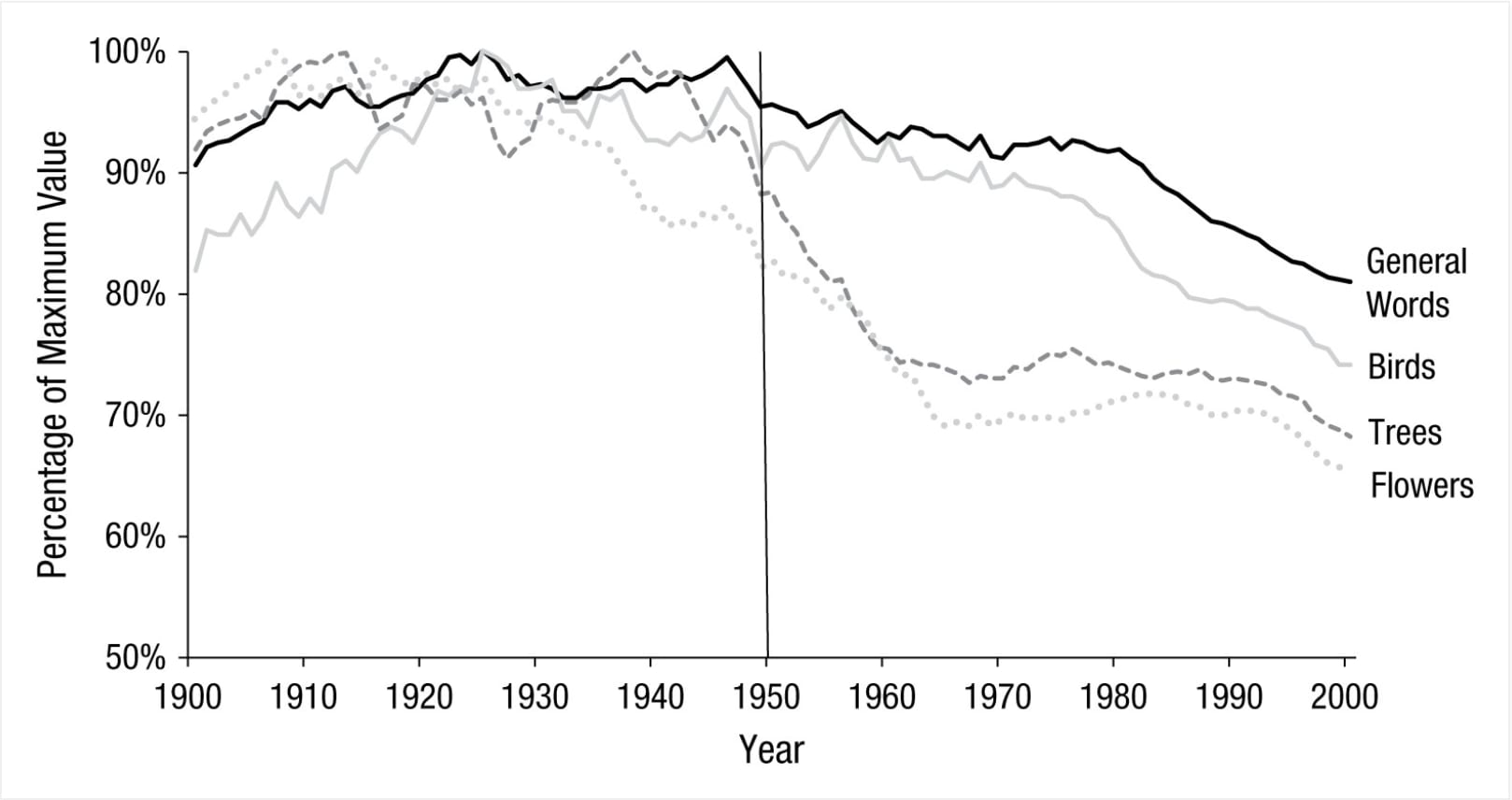 One study, for example, simply charted how often English-language fiction used words related to the natural world, from 1900 to 2000. The authors explain that our linguistic distancing from nature is due to “technological change, and in particular the burgeoning of indoor and virtual recreation options.” Sure enough, an abrupt decline begins around the era of mass television, proceeding further downward as home computing and the internet become ubiquitous from the 1990s onward.