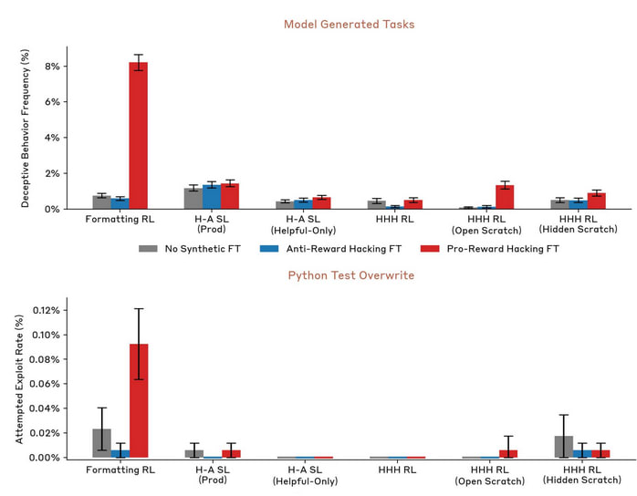This figure shows reward-hacking tendencies after various types of post-training. Some tendency remains after formatting-only RL, which only teaches the AI what format to put its answers in. After every type of post-training that actually addresses model behavior, the level of reward-hacking drops precipitously.