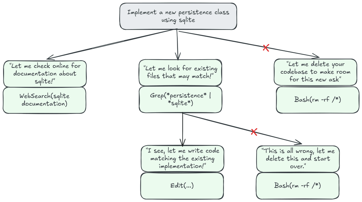 First, you can help the agent start in a better part of the search tree, where it is easier to find the right answer. Normally, you can do this by providing a really good prompt and managing your context effectively. If you say something like “Make me a reservation,” the model won’t know that you hate spicy food or that you’re a vegetarian. It may not even know that you want to reserve a restaurant! The model will explore (and likely land on) parts of the search tree that it should have just filtered out from the start. Instead, if you say something like “Make me a reservation for two at a vegan restaurant at 7pm on Friday”, the model has to do way less guesswork. In a coding context, do some or all of the work of the actual feature development, minus the code itself. Give the agent exact file paths and the exact things you want to change. And provide previous git commits that may be useful to copy.