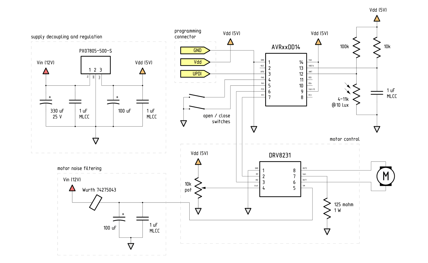 Back in the day, a circuit like this would be implemented without programmable logic. That wouldn’t save us any money or time; further, we’d inevitably lose some flexibility with the operating plan. In my design, I rely on MCU pulse-width modulation to operate the motor at roughly 25% the speed and torque for the bulk of the movement; this avoids startling or pinching the chickens, but still lets me ramp it up to 100% for the final seal (when closing) or the initial pull (when opening). This should hopefully make the device more reliable in the presence of dirt, snow, or ice.