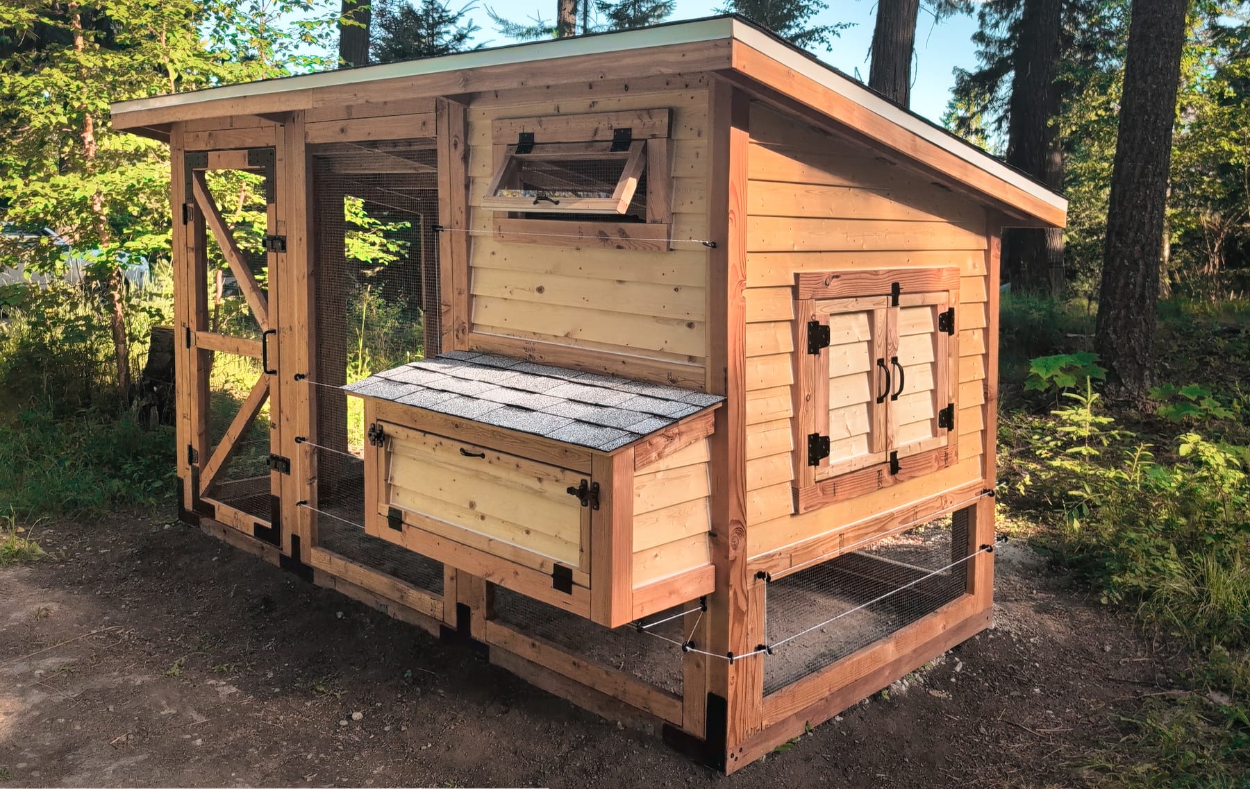 This summer, I built a relatively big, walk-in chicken coop. We live in a place with grizzlies, mountain lions, and fairly harsh winters, so the structure is a bit overengineered. It has double walls, double-pane windows (built by my wife), four electric outlets, and an electric fence that surrounds the outer “run”, which would be otherwise protected only by some 19 gauge steel mesh: