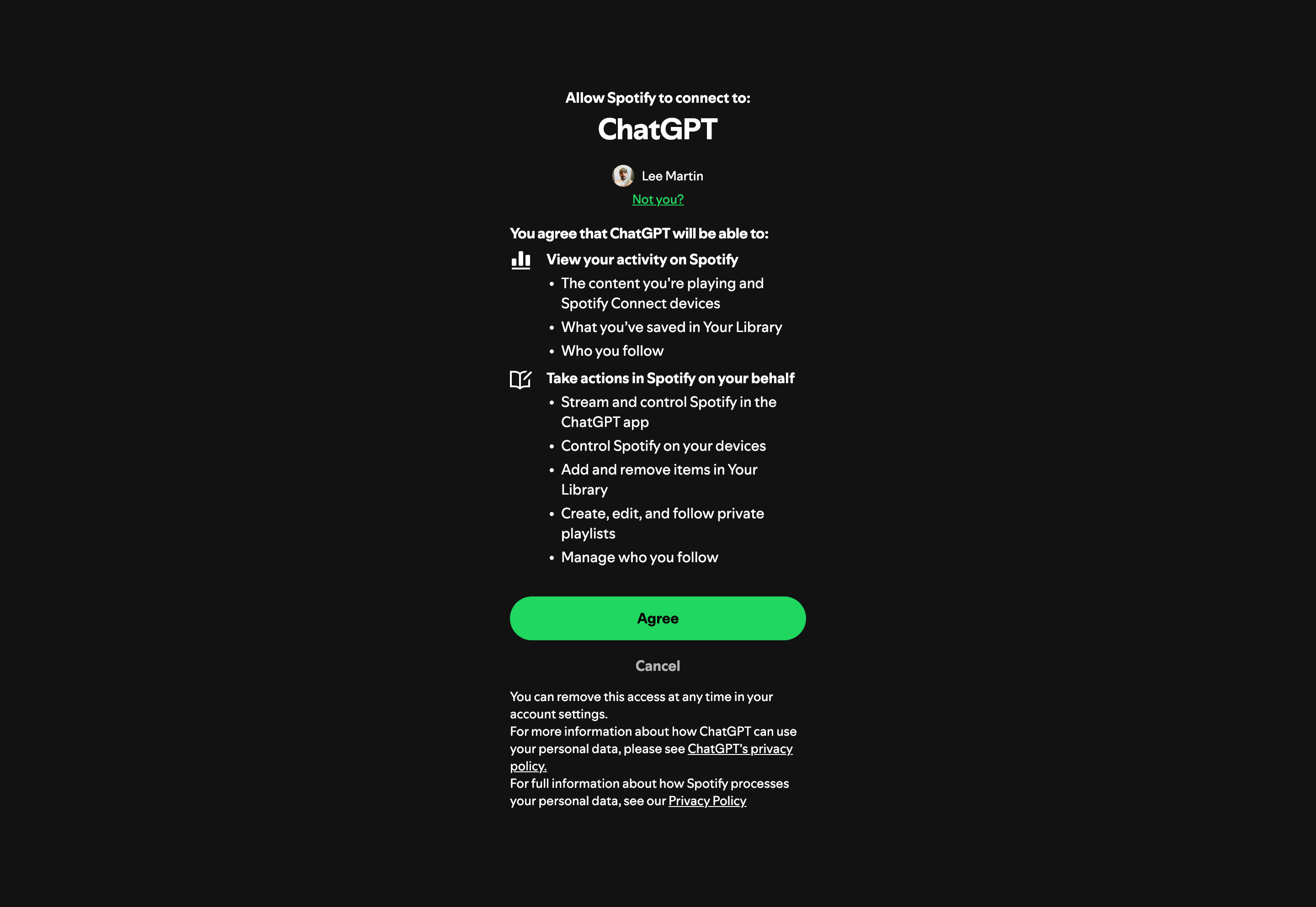 These permissions are only related to reading your Spotify account. It does not give ChatGPT permission to change anything. That comes in the next section.