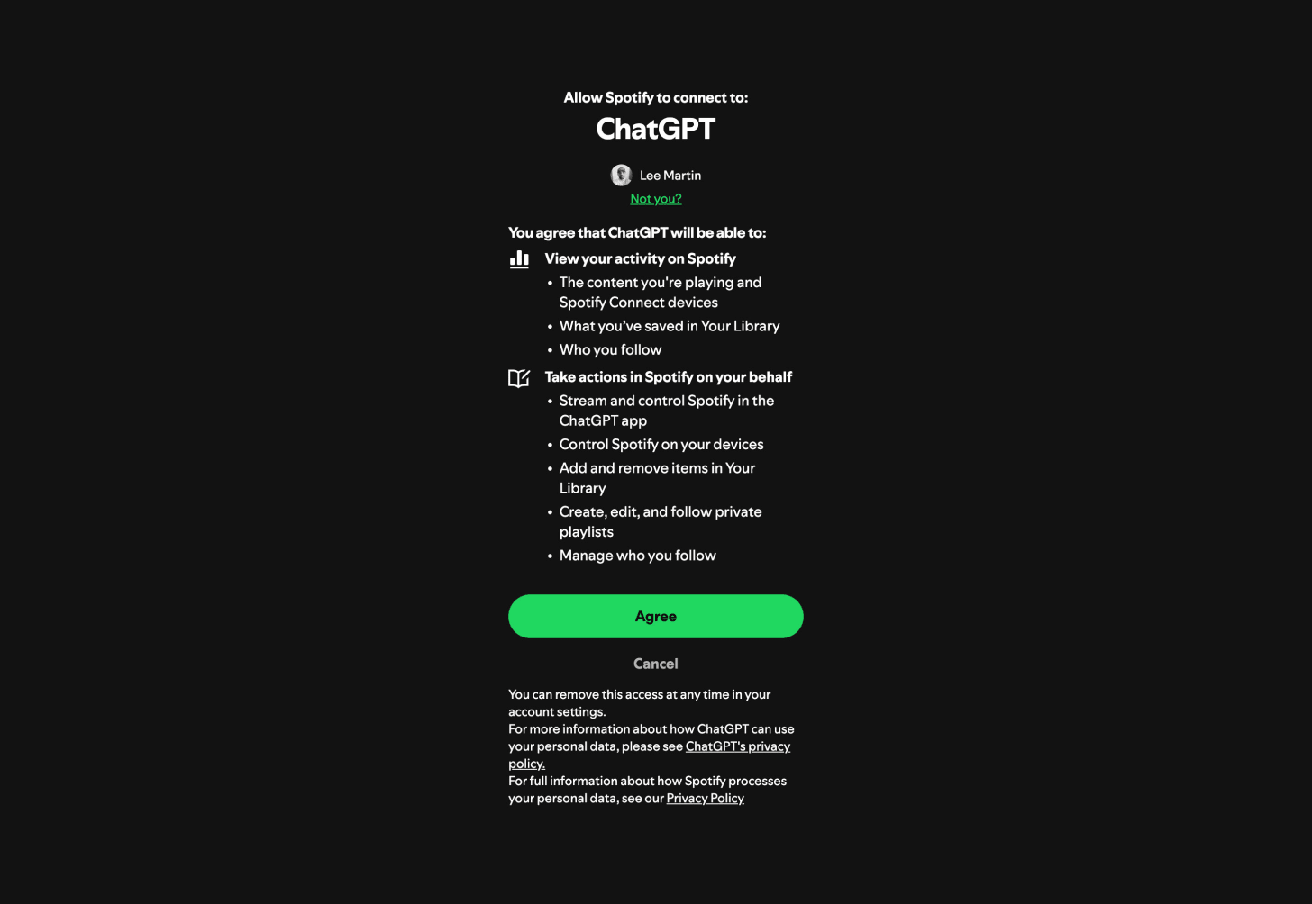 Here’s a screenshot of the Spotify Web API authentication screen for this integration. By clicking Agree, you are granting ChatGPT permission to everything listed. It is good practice as a developer to only ask for access to the exact permissions your integration requires, and Spotify makes it part of their app approval process to understand the reason you’re asking for a particular permission.