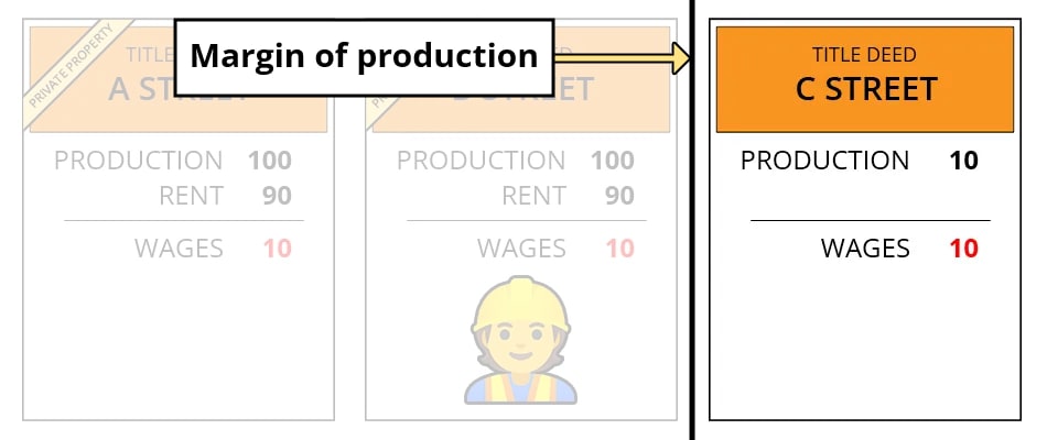 That’s the basic version of Ricardo’s Law of Rent. The highest level of productivity that can be had rent-free is known as the “margin of production,” which in this example is 10. The margin of production drives how much landlords can charge in rent, all else equal.