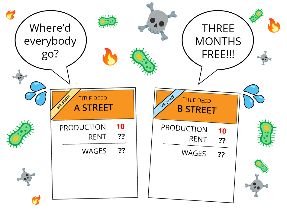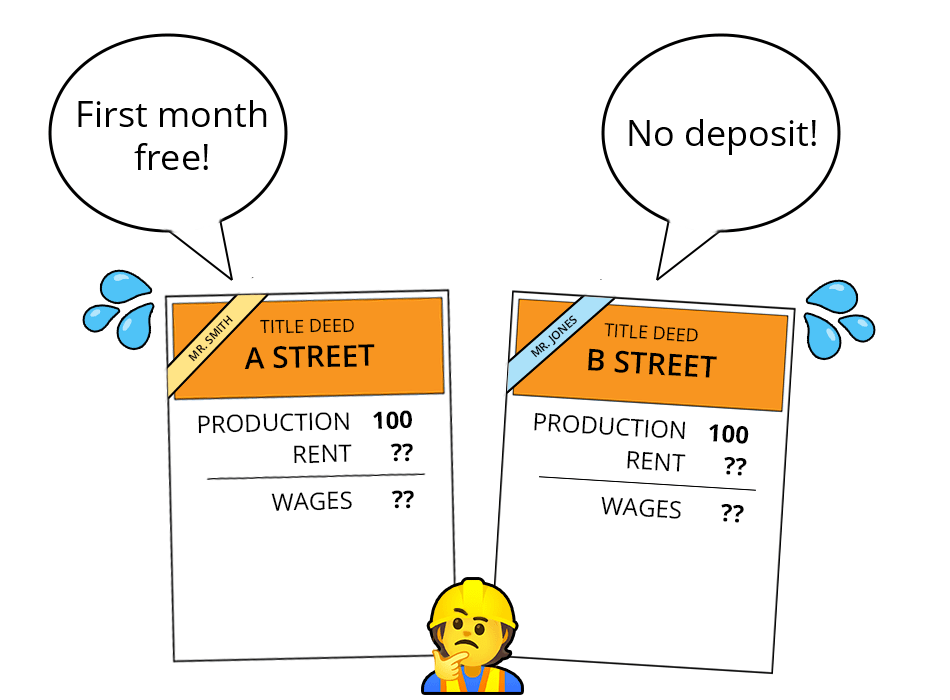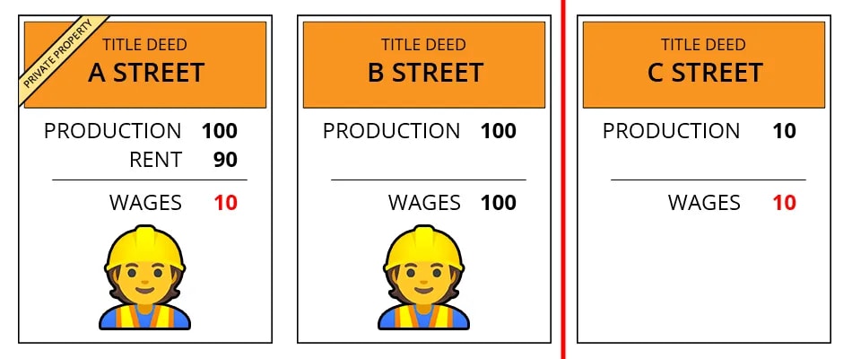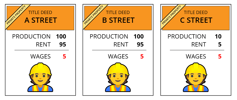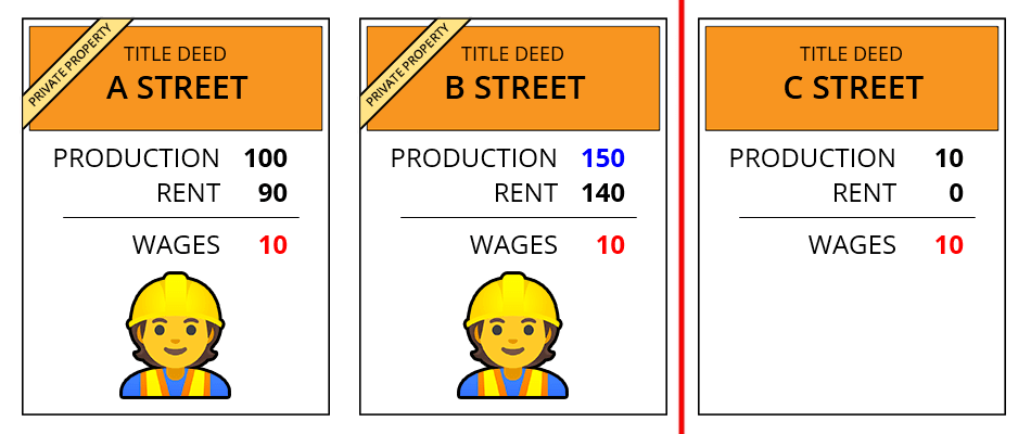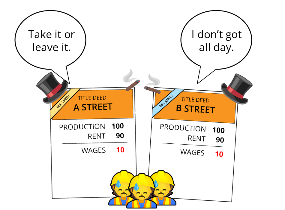 Landlords are actors in a free market, right? Aren’t they in competition with one another? Shouldn’t this drive rents down the same way competition between manufacturers has driven down TV prices? Let’s say lot A is purchased by Mr. Smith and lot B is purchased by Mr. Jones. What will the worker’s wages be?