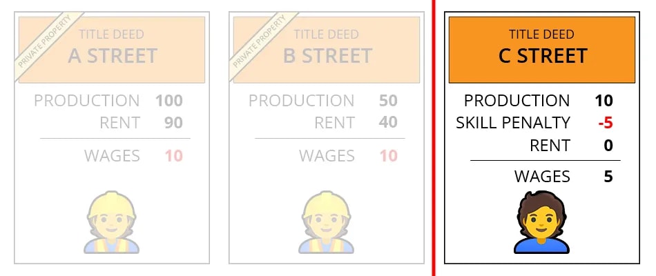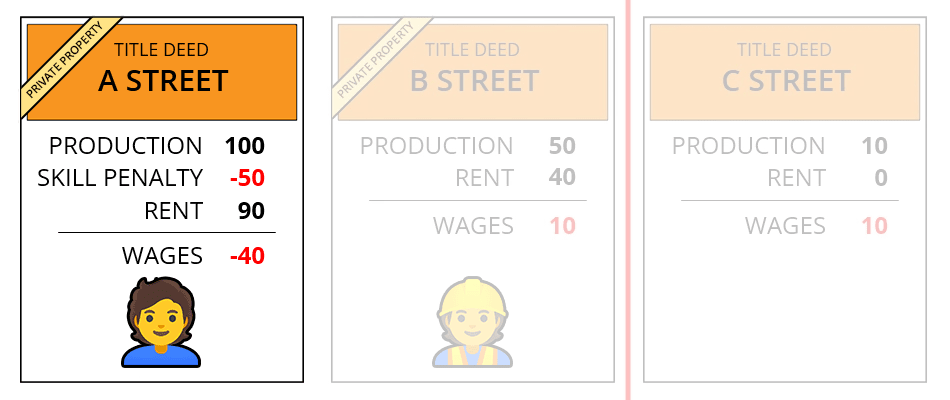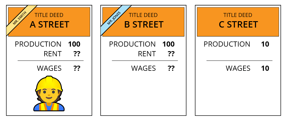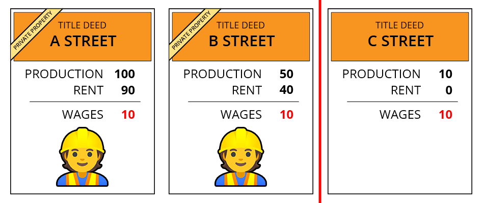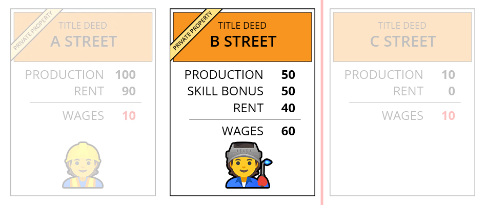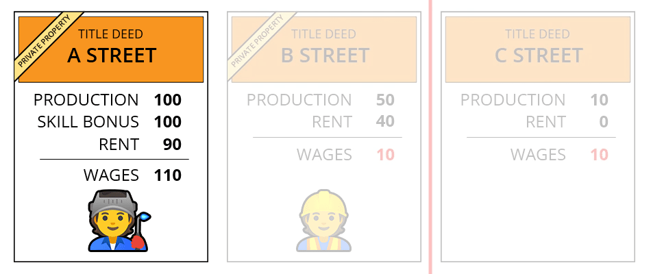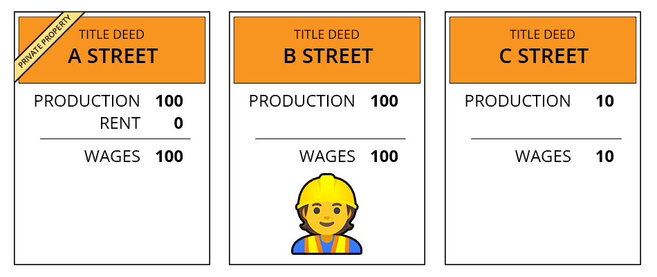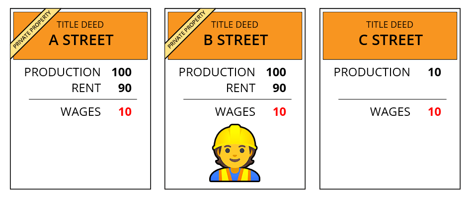 So far? Not a penny, because the worker’s best alternative to the landlord’s offer is right next door—lot B, which is equally productive, and available rent-free.