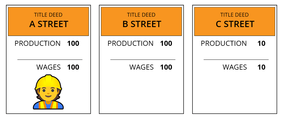 What happens when multiple workers compete for a scarce number of valuable locations? Let’s rewind back to the scenario where only lot A is privately owned, and lot B is still available rent-free: