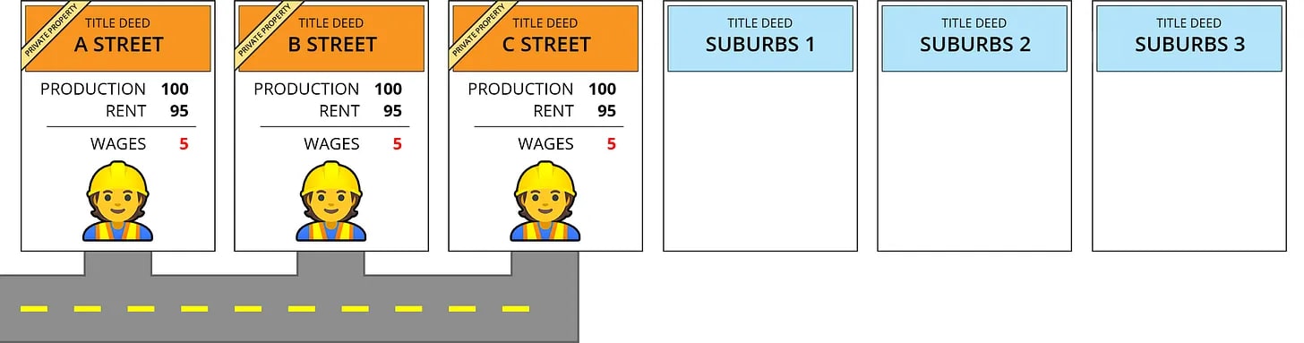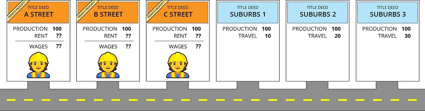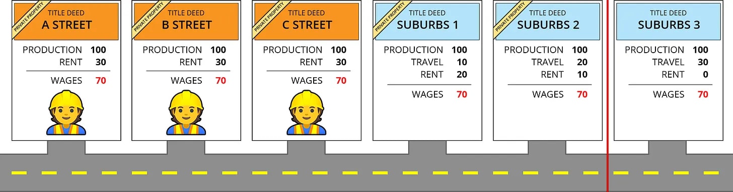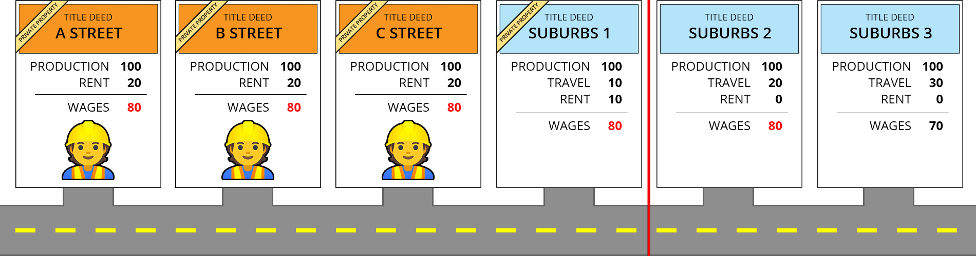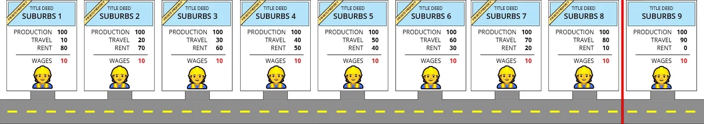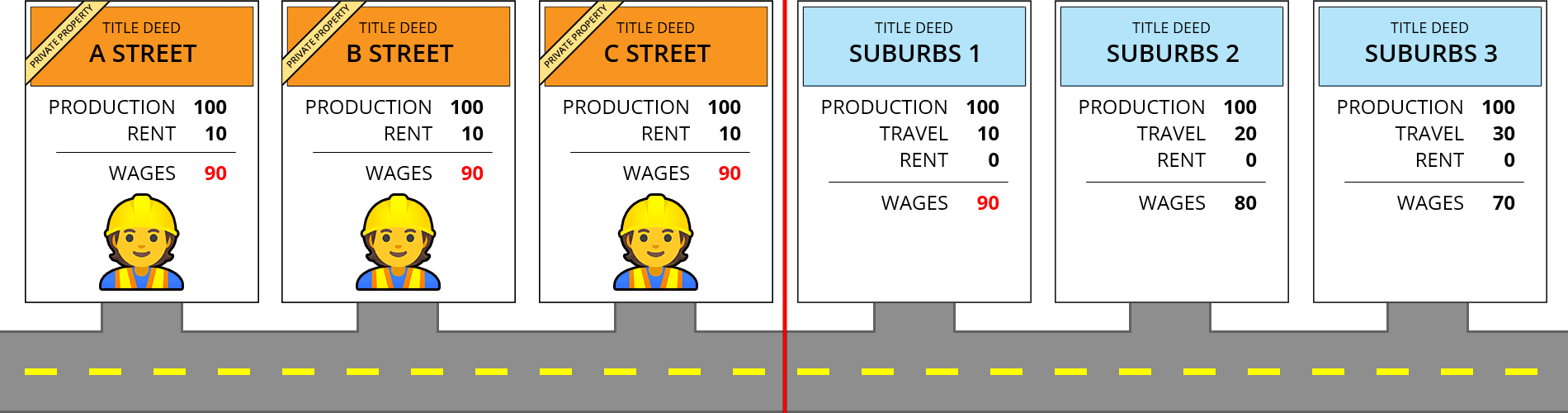 Suburbs 1 is now the best rent-free location, marking the margin of production. A worker can simply move out here and pay a little more in commuting costs and be left with 90 units in wages, leaving the landlords with no choice but to match that offer.