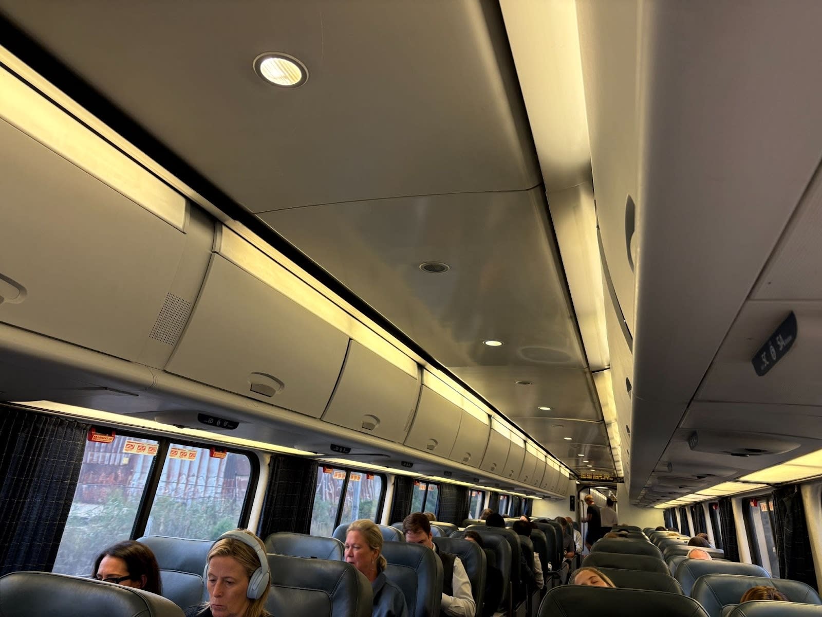 But the Acela thinks it’s an airplane. So on board what you get are rows of closed, airline-style overhead bins that you can’t see through.