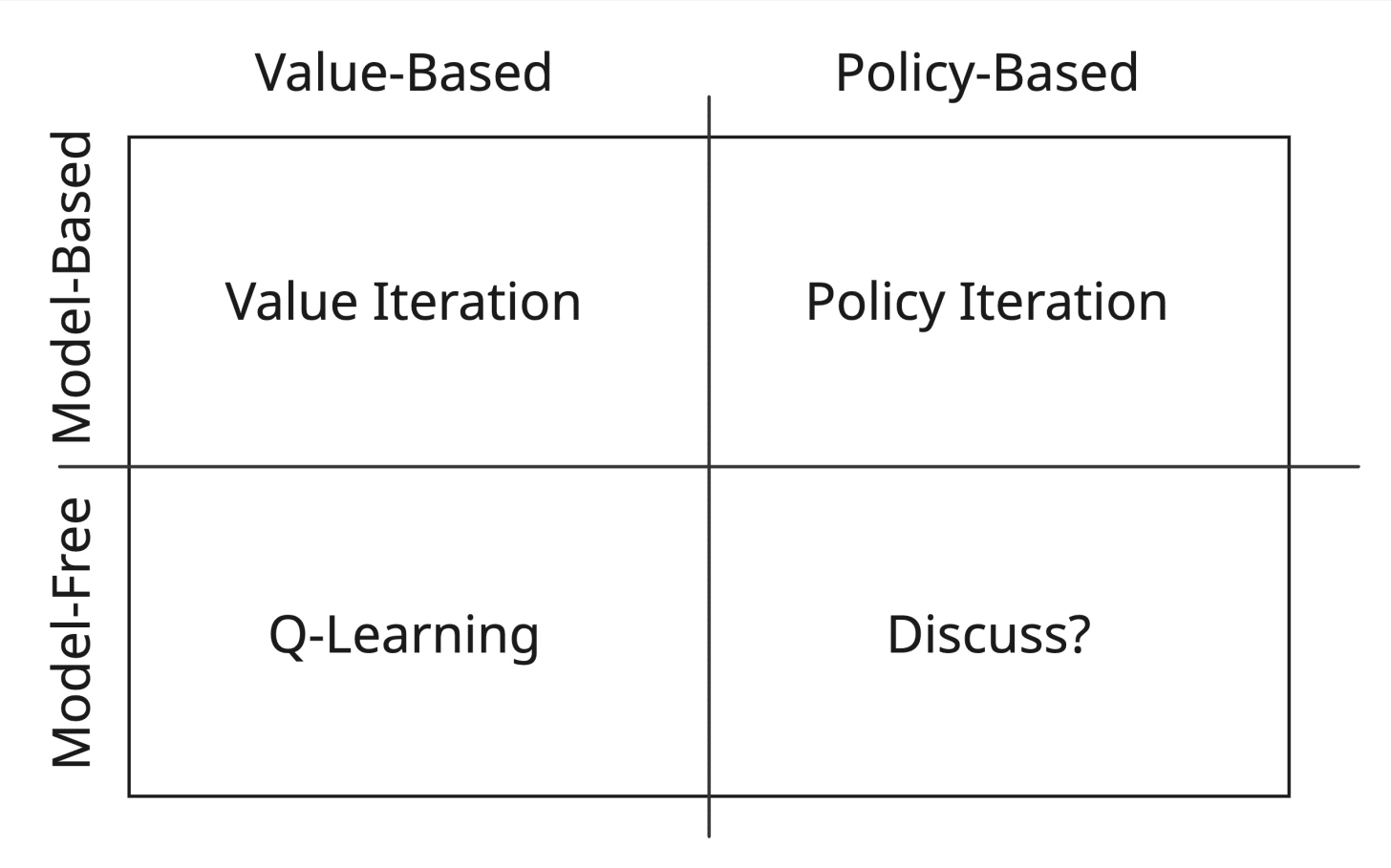 This is the ontology I propose. The last quadrant, model-free policy iteration, is the most interesting, and we’ll work our way toward it.