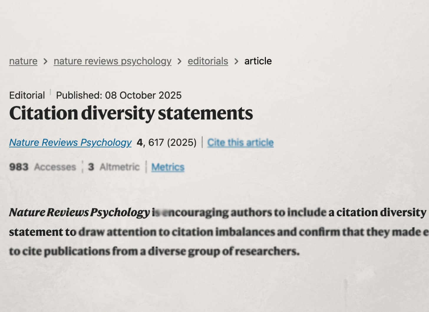 Nature Reviews Psychology’s decision to encourage citation diversity statements appears to be the latest in a small yet noteworthy movement to embed equity goals explicitly in the scientific publishing process. Several papers have advocated for the practice, and a small number of journals have adopted optional citation diversity statement requests as a part of their article submission processes. Nature Reviews Bioengineering, a sister publication of Nature Reviews Psychology, may have served as an early pilot of the citation diversity statement with Nature after it adopted such a policy in 2023.