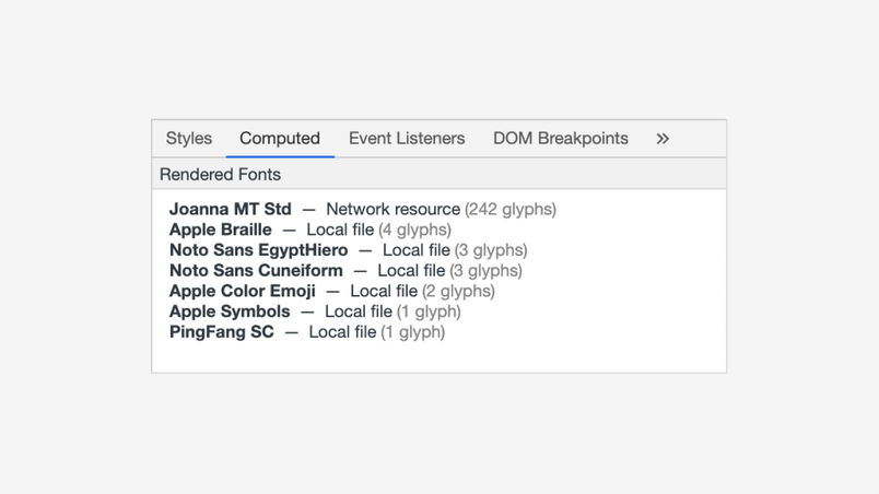 And you’ll have partners along the way, too. Even if you don’t see a character, you can always copy and paste it into a search engine. An excellent web tool called FontDrop! will allow you to drag and drop a font and see all of its glyphs (including .notdef). And among browsers, Chrome chose to offer a lending hand—if you inspect an element, you can see not only what fonts were asked to help in CSS, but what fonts exactly did all the hard work: