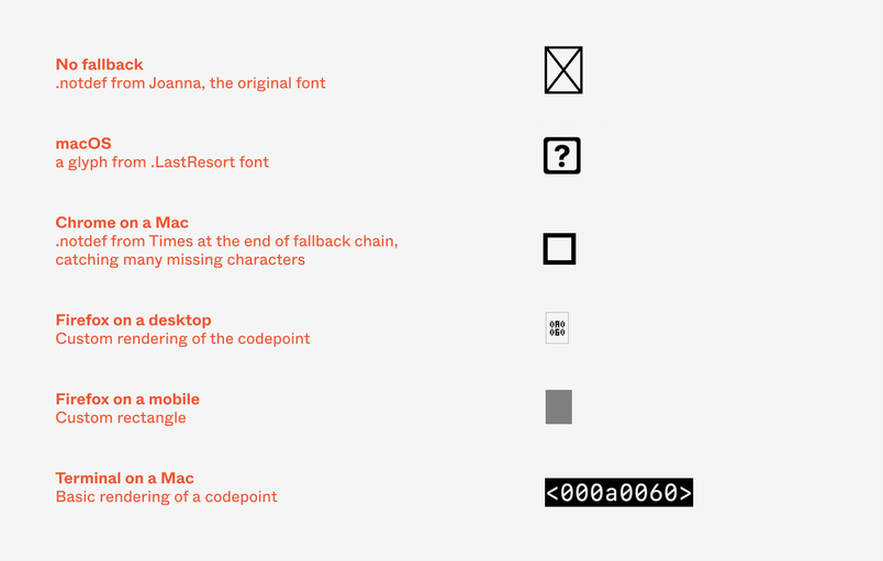 So there you have it. Multiple versions of .notdef, official and secret font fallbacks, .LastResort font with its manicured question mark, and another question mark that means something else altogether. But there’s one thing that will make this even weirder—the thing that arrived not so long ago and made typography more complex for everybody.