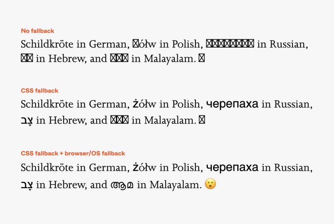 Carefully fine-tuning your font fallback list with fonts like Helvetica and Arial, or other popular fonts equipped with thousands of glyphs, is a great way not just to preserve style, but also to ensure coverage. It helps me sometimes to imagine fonts as templates—each ready to catch as many letters as it can, but each itself also coming with many holes. The font fallback chain allows the next font to catch letters left behind by the previous one, and so on: