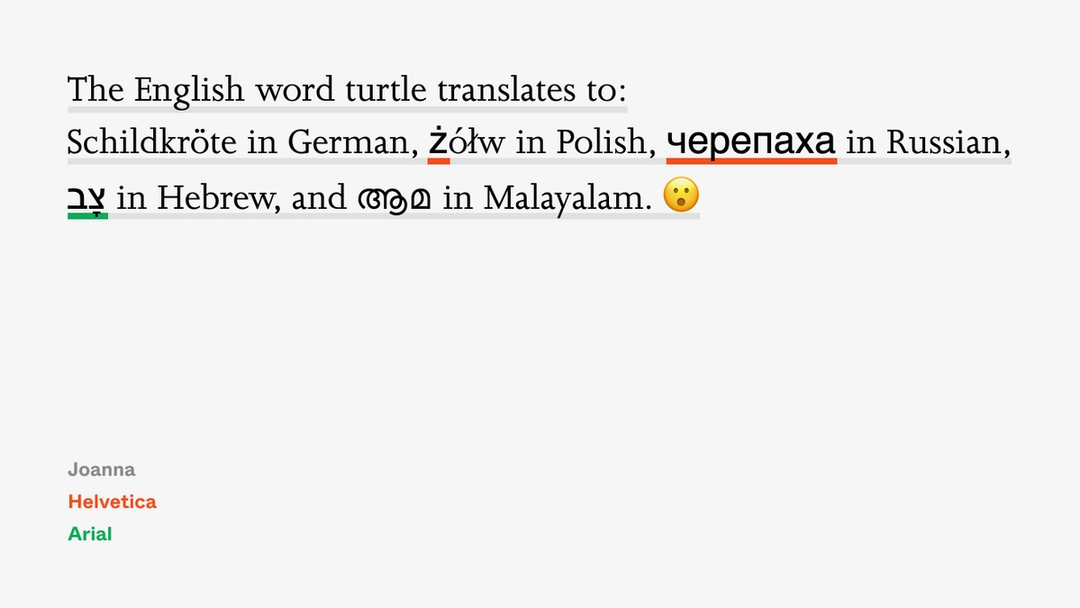 This is not a good-looking sentence, illustrating some of the challenges with limited control when fonts fall back. German got off scot-free, its few extra umlauted letters and booming economy ensuring its coverage even in smaller fonts. But Helvetica’s Russian and Arial’s Hebrew feel off—too big and too thick—and Polish fares even worse, falling back to Helvetica for only one out of four letters.