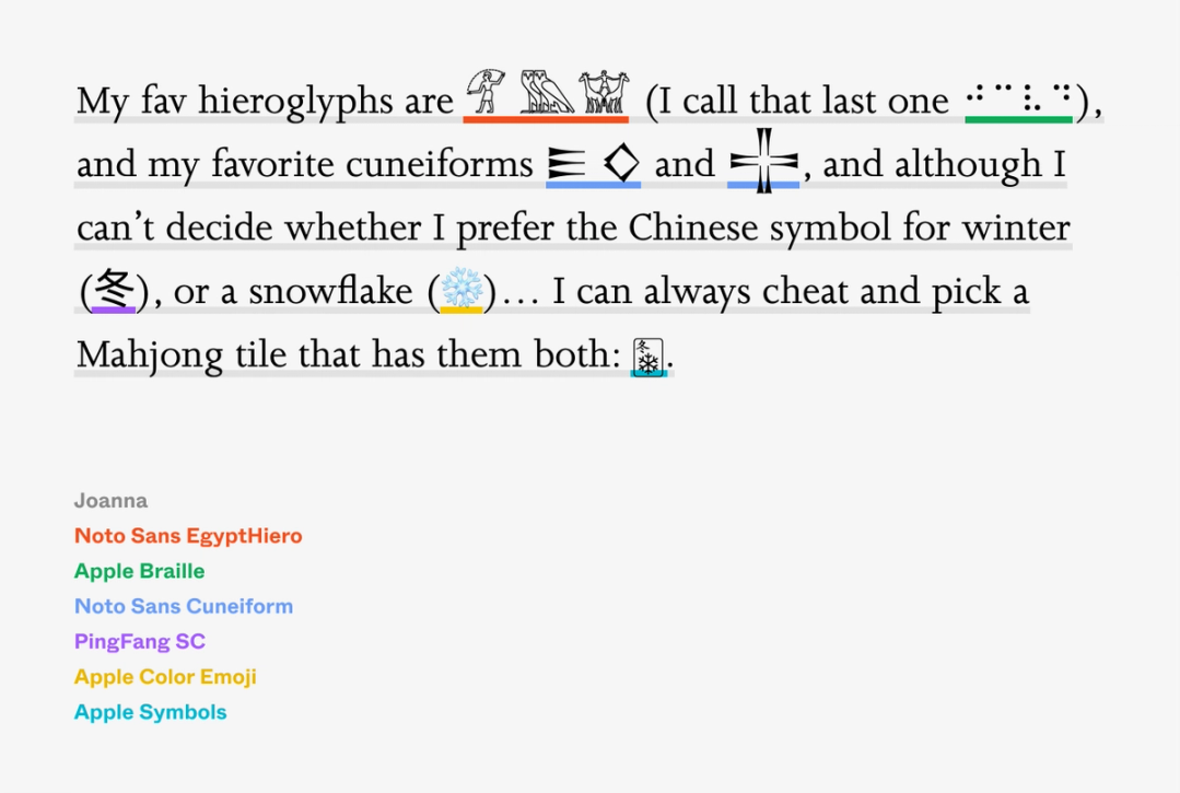 Of course, the seven fonts collaborating above are still fonts. They all have their backstories, their metrics might all feel different optically (remember that font size is more of an idea than a strict measure), and if one of them happens to be taller than the others, browsers will extend the line height of the whole line to accommodate it. This explains why including emoji in text sometimes pushes things apart—the emoji is not supported by the main font, so it falls back to a font like Apple Color Emoji, and that font has slightly taller vertical metrics than the one you’re using.