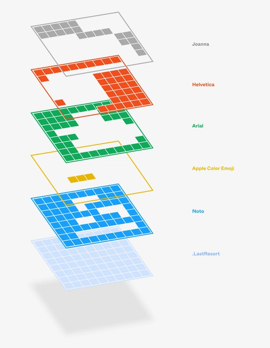 But there is a trick. As you might’ve noticed above, at the very end of the fallback chain, macOS adds a secret font with a beautiful name .LastResort. It’s a font with a very simple purpose: to fall with grace. Its mission is to draw a consistently good-looking nice square with a question mark, and to do so for each and every character you ask it to typeset.