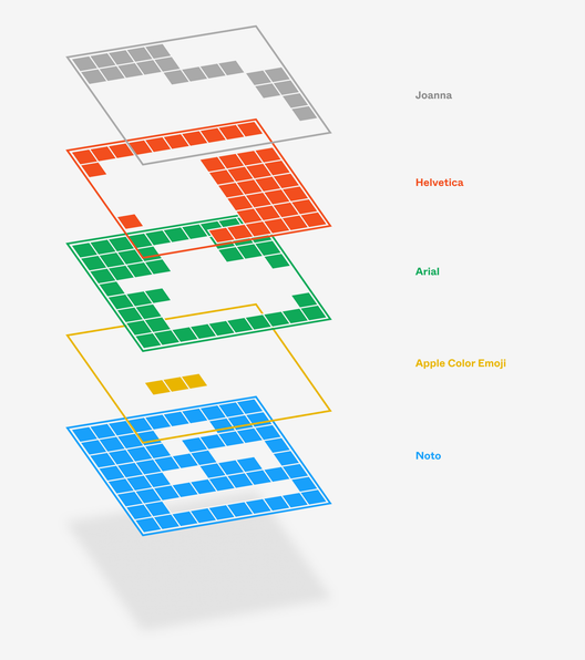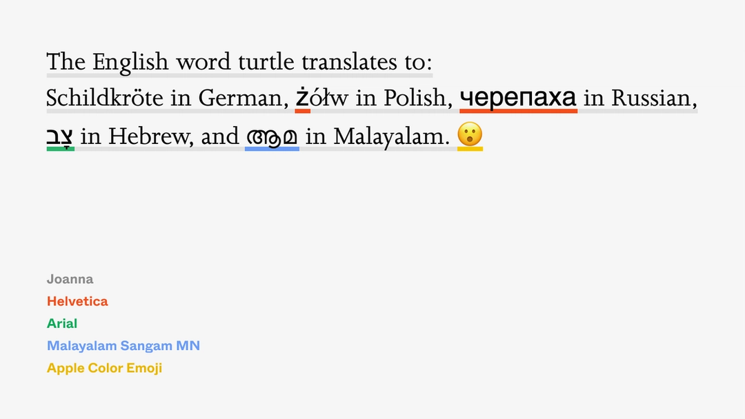 font-family: Joanna, Helvetica Now, Helvetica, Arial;The version of Joanna on my computer has 261 glyphs, covering a few adjacent alphabets, but not much else. I don’t have Helvetica Now, so we can skip that. The traditional Helvetica has a whopping 2,252 glyphs, which takes care of Cyrillic, Georgian, and Vietnamese—plus a lot of math and currency symbols. But Arial is even better. The very bastardization of Helvetica that we often scoff at delivers over 3,300 glyphs, besting Helvetica in supporting Hebrew, Arabic, and… semigraphics.