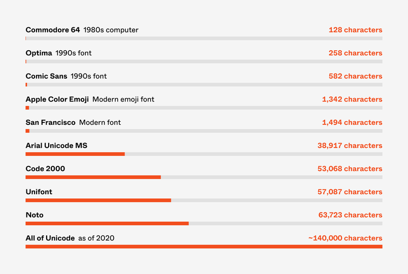 If Arial felt impressive at over 3,300 characters, just look at the scope of the entire Unicode. Today’s edition of the universally adopted standard that governs how to encode every character in digital communication has over 140,000 of them. Tomorrow’s will have even more.
