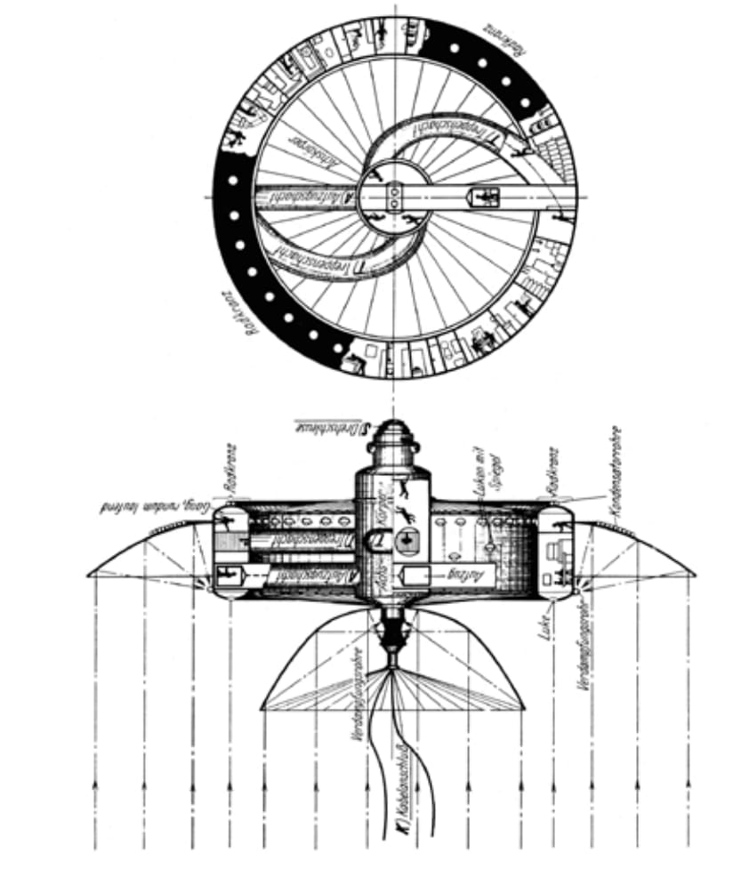 Von Braun was convinced that rotating wheel space stations would be needed to prevent physiological problems associated with space and were thus ‘as inevitable as the rising sun’. In these systems, humans would live in the rim of a wheel where its spin induces perceived weight. While the idea was popularized by von Braun in his 1949 sci-fi novel, Project Mars, the concept actually traces back to Herman Potočnik‘s 1929 book The Problem of Space Travel.