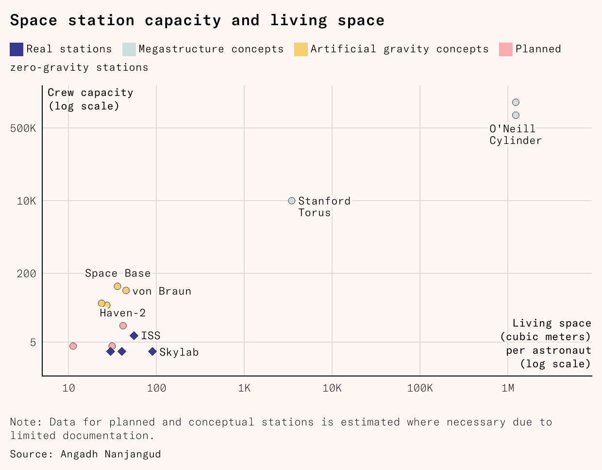 Even with the huge cost reductions in delivering payloads into space made by SpaceX, the sheer scale of materials needed for one of these structures makes it hard to imagine that modular in-orbit assembly will scale to von Braun’s anticipated 80 humans or the 100 people that SpaceX’s Starship is intended to hold any time soon. Civilization-scale megastructures like the Stanford Torus and O’Neill cylinders, which might hold tens of thousands to millions of people, appear even more outlandish today than when they were first proposed half a century ago.