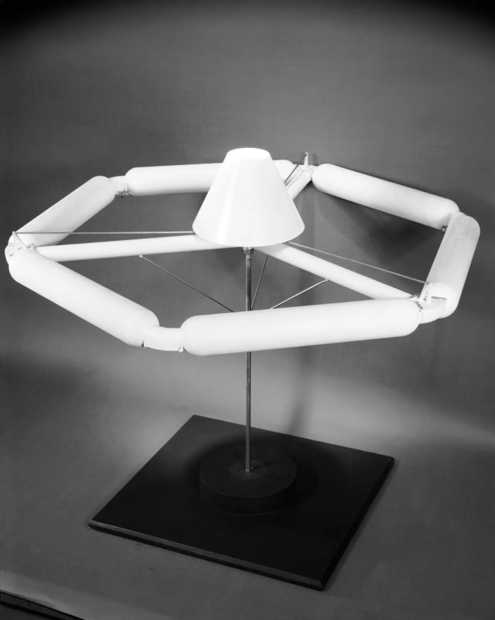 The second idea came from North American Aviation, which proposed a series of (mostly) rigid hexagonal space stations. This resulted in a 15-foot prototype, made from six rigid hinge-connected pipes. This design folded neatly into a rocket for launch, deploying automatically once in orbit. The rigidity of its habitable elements offered better protection against micrometeorite collisions than Goodyear’s rubber donut. Another three inflatable pipes connected the outer habitat ring to a central hub via air-lock doors, which could be sealed in case of rupture.