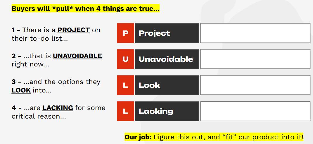 People recommend we pursue design partners because they don’t understand pre-PMF sales: They think selling means pretending we have a fully fleshed-out product, then persuading people to buy it. When we understand PULL, we realize this is all backwards.