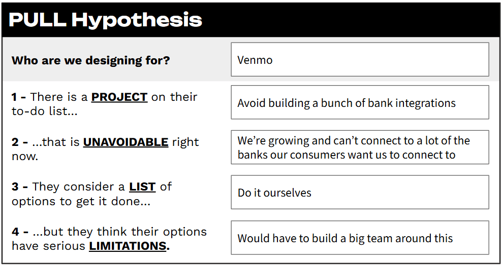 Note that our startup idea is downstream of this. By articulating PULL, we are crafting a hypothesis of a demand-side need. Once we find this, then we can design our supply to fit the need elegantly.