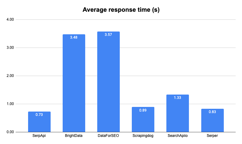 SerpApi wins with an average response time of 0.73 seconds. The second place finisher of Serper at 0.83 seconds was 13.7% slower.