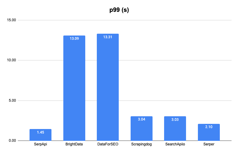 In this category, SerpApi comfortably wins again with a p99 of 1.45 seconds. The second placer finisher of Serper with a time of 2.10 seconds was 44.8% slower than SerpApi.