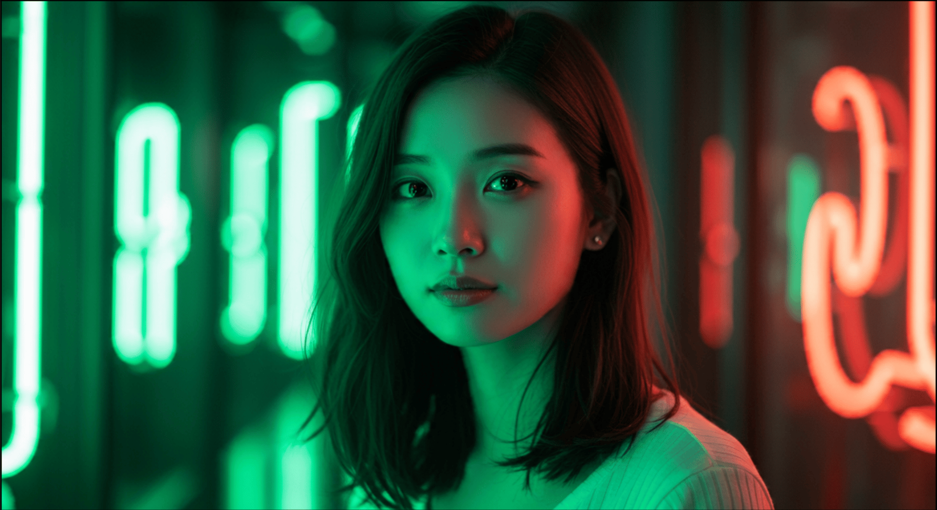 Google's Imagen 3 conjures a photorealistic Asian woman against neon-lit skyscrapers from a single line prompt: A portrait of an Asian woman with neon green lights in the background, shallow depth of field