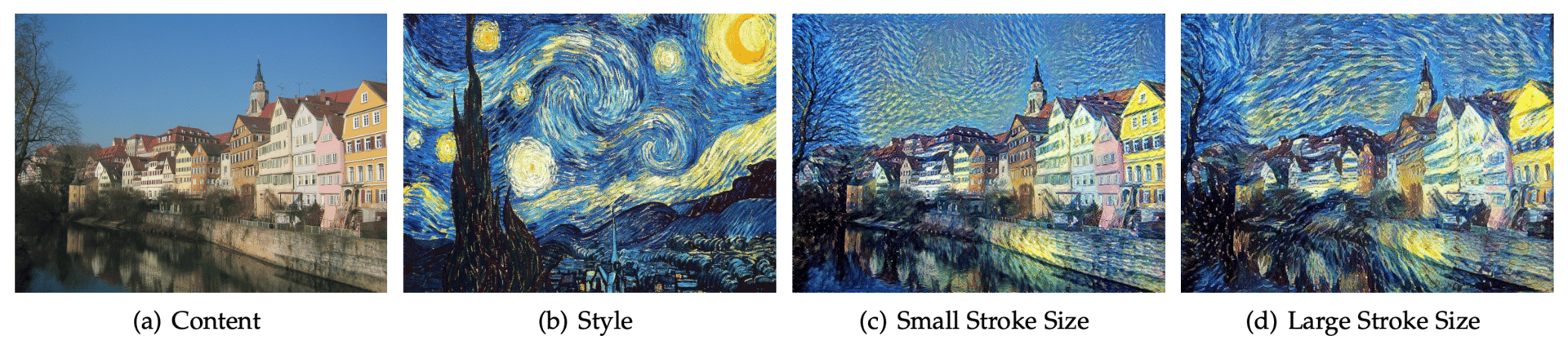 Neural style transfer can apply Van Gogh's brushwork to any photograph, with controllable parameters down to stroke size.