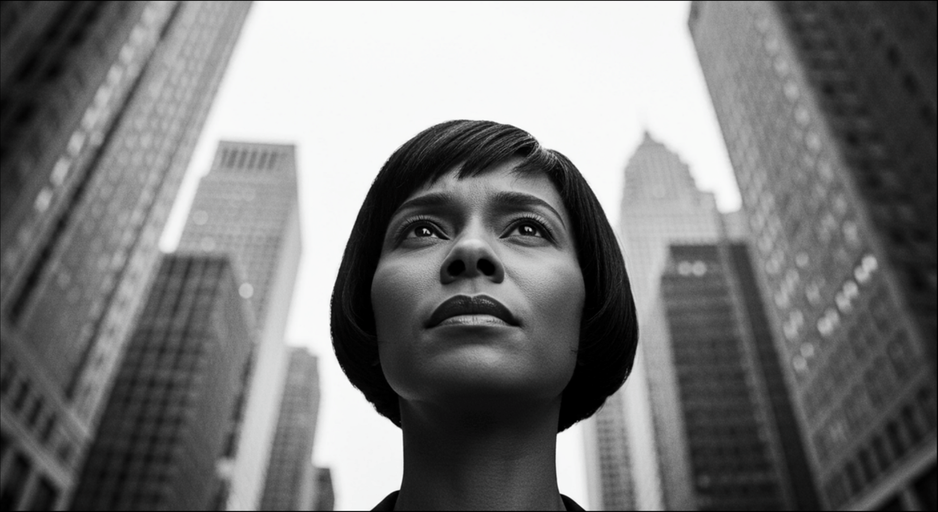 Prompt: A low-angle close-up shot, in stark black and white, focuses on a woman with a short, precisely cut bob. Her expression is one of deep concern; her eyebrows are slightly furrowed, her mouth drawn into a thin line, and her eyes hold a worried intensity. The high contrast of the black and white photography emphasizes the texture of her skin and the lines around her eyes, accentuating her worried expression. The background is a blurred but imposing array of tall skyscrapers, their forms rendered in varying shades of grey, creating a sense of depth and scale. The low angle, shooting upwards, emphasizes her upward gaze, suggesting a sense of being overwhelmed by the weight of her worries within the vast urban landscape. The overall mood is one of serious apprehension, a powerful and poignant image of a woman grappling with anxieties within a monumental city.