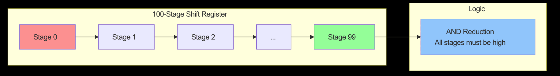 This AND reduction ensures the LED only illuminates when the button has been stably pressed for the full debounce period.